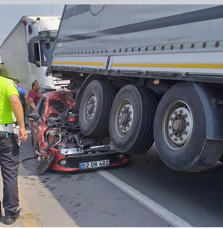 Alınan ilk bilgilere göre Akçaabat’tan Trabzon istikametine seyir etmekte olan 52 DR 482 plakalı araç tırın altına girdi. Yaşanan kaza sonucu arkadan gelen yabancı plakalı başka bir tır kaza yapan Ordu plakalı araca çarptı.