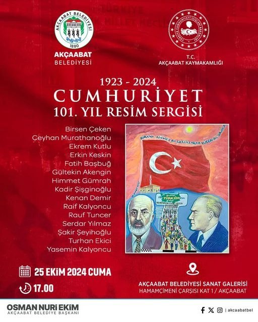 Akçaabat Belediyesi ev sahipliğinde düzenlenecek etkinliklerin ilki, 25 Ekim 2024 Cuma günü saat 17.00'de Akçaabat Belediyesi Sanat Galerisinde açılacak olan "Cumhuriyet 101. Yıl Resim Sergisi" ile başlayacak. Sergide, 15 farklı ressamın eserleri sanat tutkunlarıyla buluşacak.