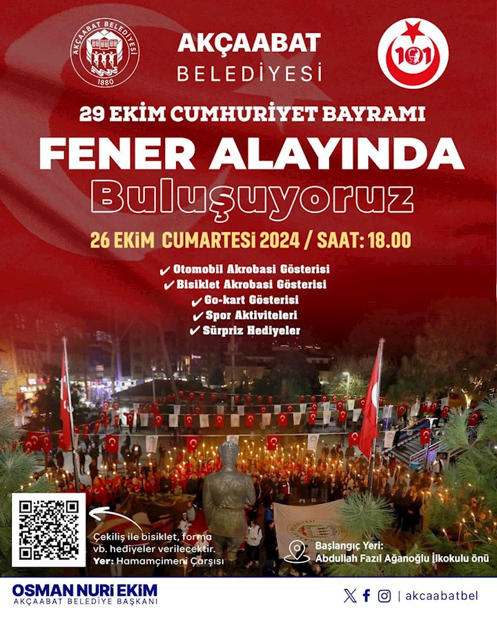 Kutlamalar, 26 Ekim Cumartesi günü saat 18.00'de gerçekleşecek olan Fener Alayı ile devam edecek. Fener alayı, Akçaabat Abdullah Fazıl Ağanoğlu İlkokulu önünden başlayacak ve coşkulu bir yürüyüşle Akçaabat sokaklarını aydınlatacak. Etkinlik kapsamında otomobil akrobasi gösterisi, bisiklet akrobasi gösterisi, go-kart gösterisi ve çeşitli spor aktiviteleri yer alacak. Katılımcılara sürpriz hediyeler de dağıtılacak.