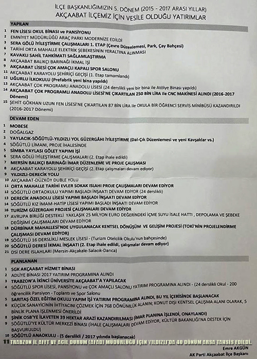 Emre Akgün kendi döneminde Akçaabat'ta yapılan yatırımları ise şu şekilde sıraladı.