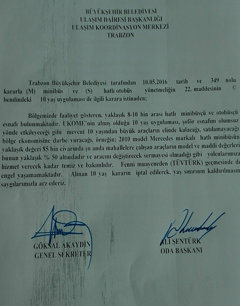 Akçaabat Şoförler ve otomobilciler esnaf Odası Başkanı Ali Şentürk dilekçeyi sunduktan sonra yaptığı açıklamada şu ifadelere yer verdi; Büyükşehir belediye başkanlığına minibüslerdeki on yaş uygulaması ile ilgili itiraz dilekçemizi yazdık UKOME'ye teslim ettik,inşallah almış oldukları bu yanlış kararı tekrar gözden geçirerek kararı iptal ederler.
