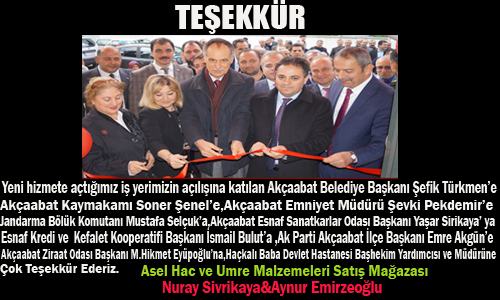 Sahipliğini Nuray Sivrikaya-Aynur Emiroğlu’nun Yaptığı Asel Hac ve Umre Malzemeleri mağazasının bugün yapılan açılış törenine Akçaabat Kaymakamı Soner Şenel, Akçaabat Belediye Başkanı Şefik Türkmen, Akçaabat Emniyet Müdürü Şevki Pekdemir, Akçaabat Garnizon komutanı Binbaşı Mustafa Selçuk, Ak Parti Akçaabat İlçe Başkanı Emre Akgün Akçaabat Esnaf Odası Başkanı Yaşar Sivrikaya S.S.Akçaabat Esnaf sanatkârlar kredi ve kefalet kooperatifi başkanı İsmail Bulut, Akçaabat Ziraat Odası Başkanı Hikmet Eyüpoğlu, Haçkalı Baba Devlet Hastanesi Başhekim Yardımcısı Osman Bulut, Hastane Müdürü Davut Gedikli, Banka Müdürleri ve vatandaşlar katıldı.