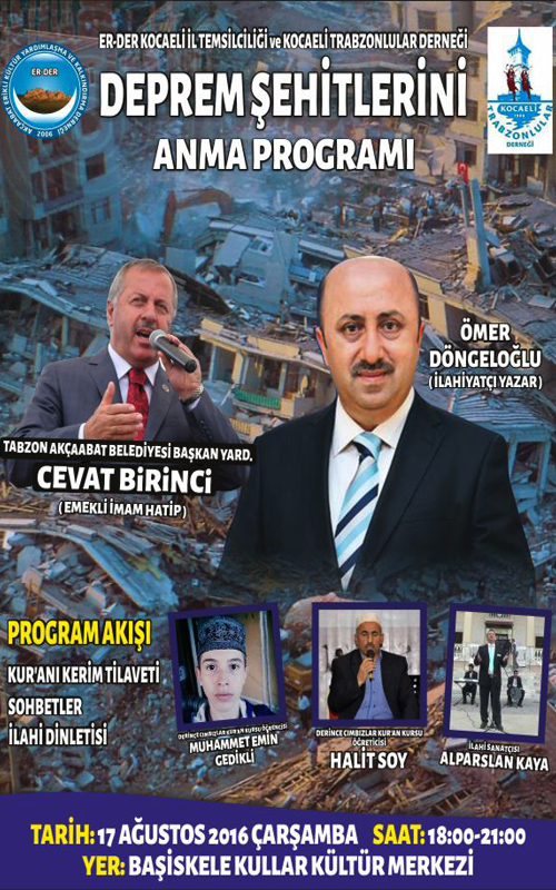 Marmara bölgesinde meydana gelen deprem nedeniyle ER-DER Kocaeli il temsilciliği ve Kocaeli Trabzonlular Derneği işbirliğiyle Deprem Şehitlerini anma programı düzenlendi. 17 Ağustos 2016 tarihinde Başiskele Kullar kültür merkezinde saat 18.00 de düzenlenecek programa İlahiyatçı yazar Ömer Döngeloğlu ve Akçaabat Belediye başkan yardımcısı Cevat Birinci konuşmacı olarak katılacaklar.
