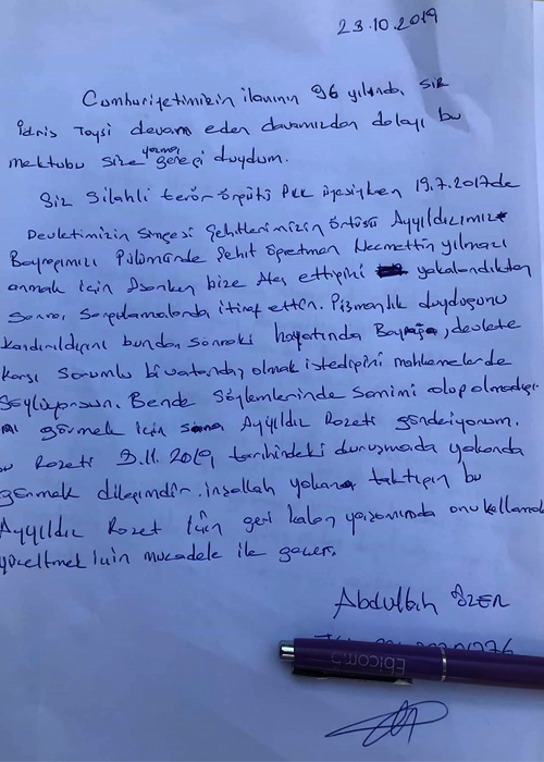 Saldırıdan sonra başka bir operasyonda yakalanan İdris Taysi ile davası devam eden Özer, Taysi’nin tutuklu bulunduğu Elazığ Cezaevine kargo ile mektup ve ayyıldız Türk Bayrağı rozeti gönderdi. Özer, mektubunda, “Cumhuriyetimizin ilanının 96. yılında İdris Taysi ile devam eden davamızdan dolayı bu mektubu kaleme alma gereği duydum. Silahlı terör örgütü pkk üyesi olan Taysi, 19.07.2017 yılında devletimizin simgesi şehitlerimizin örtüsü ayyıldızımızı Pülümür’de asarken bize ateş ettiğini yakalandıktan sora sorgunda itiraf ettin. Pişmanlık duyduğunu, kandırıldığını söyledin.