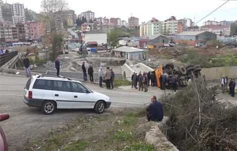 Akçaabat’ta hafriyat yüklü kamyon devrildi.