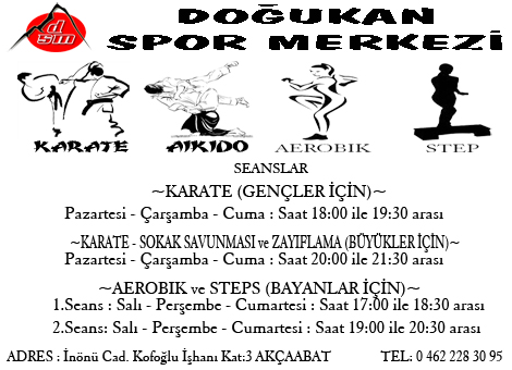 Bayanlara yönelik bayan antrenör eşliğinde Aerobik ve steps gençlere yönelik tecrübeli ve başarılı antrenör kadrosu ile Karate. ve Büyüklere yönelik sokak savunması. Ve kendiniz zinde tutmak isteyenlere yönelik zayıflama antremanları ile ilçemizde hizmet vermekte olan Doğukan Spor Merkezinin antreman seansları şöyle: