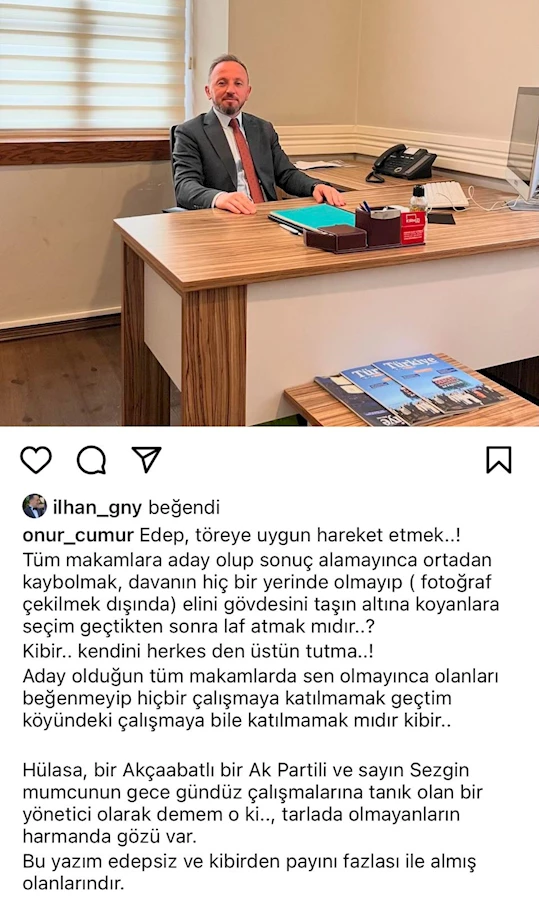 Cumur'un paylaşımında ayrıca, “Kibir… kendini herkesten üstün tutma! Aday olduğun tüm makamlarda sen olmayınca olanları beğenmeyip hiçbir çalışmaya katılmamak, onu da geçtim köyündeki çalışmaya bile katılmamak mıdır? Hülasa, bir Akçaabatlı bir AK Partili ve Sayın Sezgin Mumcu’nun gece gündüz çalışmalarına tanık olan bir yönetici olarak demem o ki, tarlada olmayanların harmanda gözü var.” ifadeleri yer aldı.