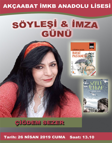 2014 yılında yayımlanan Alfabeden Kaçan Harfler adlı çocuk şiirleri kitabıyla Türkan Saylan Sanat Ödülü’ne değer görülen Sezer’in ilk çocuk romanı, Juju Beni Unutma (2015). Hayal Vadisi (2011), Gizemli Yabancı (2014) ve Şahane Ekip (2015) adlı gençlik romanlarıyla da tanınan ve son romanı Hayat Pastanesi’ni (2017) Köprü Kitaplar için yazan Sezer, Akçaabat İMKB Anadolu lisesi öğretmen ve öğrencilerle kitapları hakkında sohbet ederek ,imza etkinliğiyle programını tamamladı.