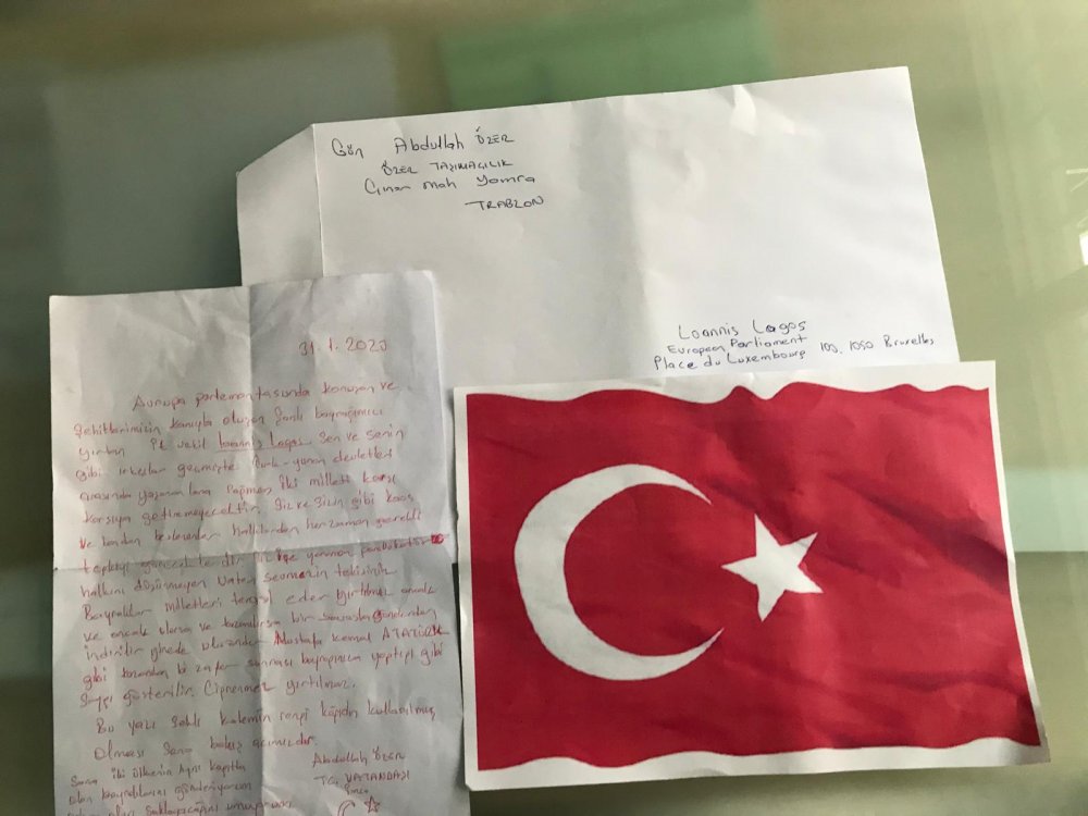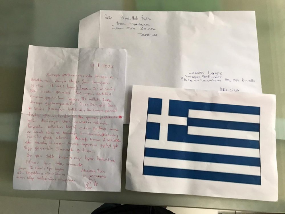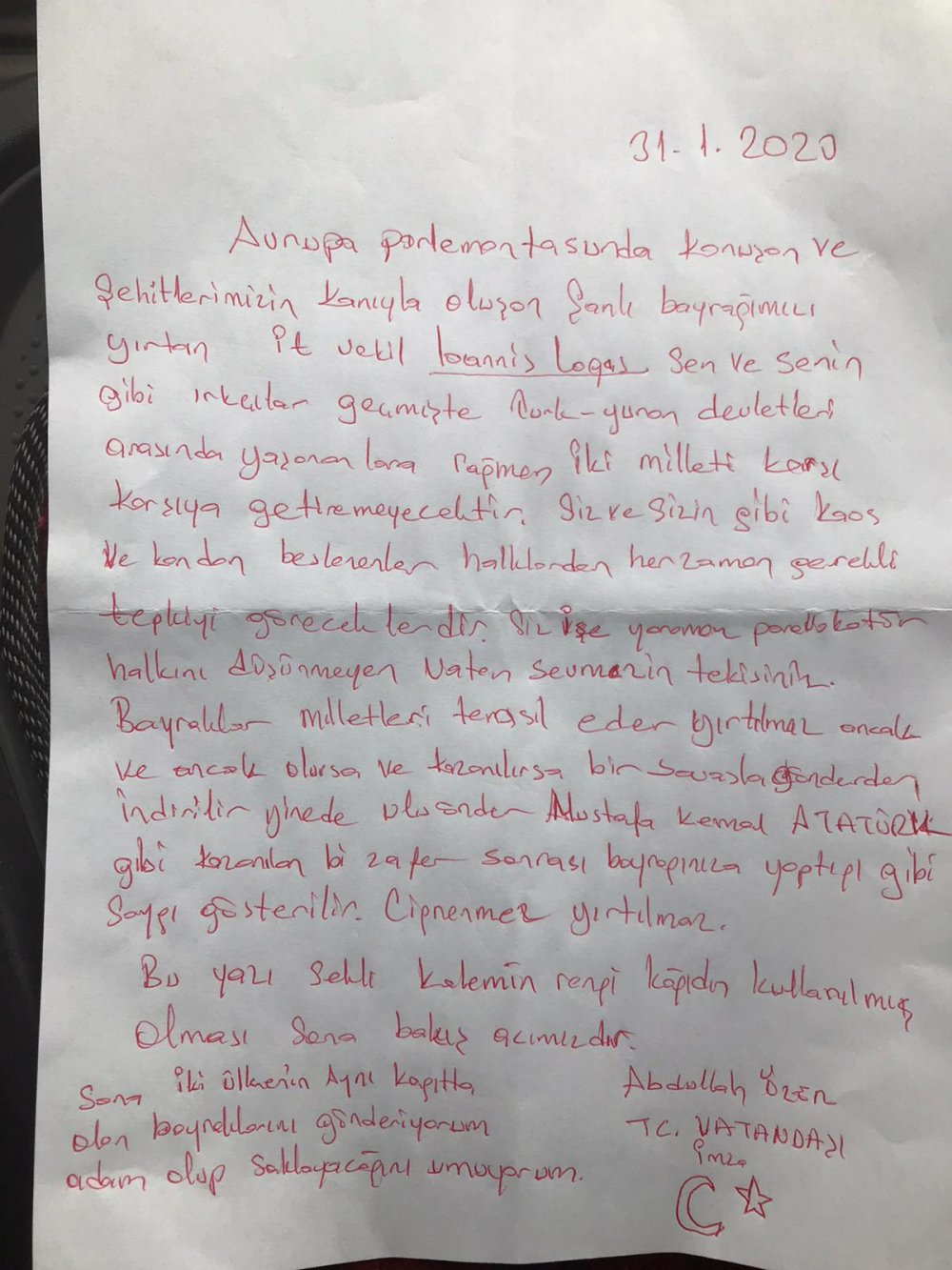 Bayrak sevgisi ile ön plana çıkan ve filosundaki TIR’ların tamamının kupalarına ile dorselerine astığı Dev Türk Bayrakları ile uluslararası yollarda Türk Bayrağı’nı dalgalandıran Özer, mektubunu özellikle beyaz kullanılmış kağıda, kırmızı kalemle yazdı. Özer mektubunda, “Avrupa Parlamentosuna konuşan ve şehitlerimizin kanıyla oluşan şanlı bayrağımızı yırtan vekil Loannis Lagos sen ve senin gibi ırkçılar geçmişte Türk-Yunan devletleri arasında yaşananlara rağmen iki milleti karşı karşıya getiremeyecektir. Siz ve sizin gibi kaos ve kandan beslenenler halkımızdan her zaman gerekli tepkiyi görecektir. Siz işe yaramaz, provokatör, halkını düşünmeyen vatan sevmezin tekisiniz. Bayraklar milletleri temsil eder, yırtılmaz ancak ve ancak olursa ve kazanılırsa bir savaşla gönderden indirilir yine de ulusundur. Mustafa Kemal Atatürk gibi kazanılan bir zafer sonrası bayrağınıza yaptığı gibi saygı gösterilir. Çiğnenmez yırtılmaz. Bu yazı şekli, kalemin rengi, kağıdın kullanılmış olması sana bakış açımızdır. Sana iki ülkenin aynı kağıtta olan bayraklarını gönderiyorum. Adam olup saklayacağını umuyorum” dedi. Özer, mektubun son kısmına da adını soyadını yazarak imza olarak da Türk Bayrağı çizip kargo ile Yunanistan milletvekiline gönderdi.
