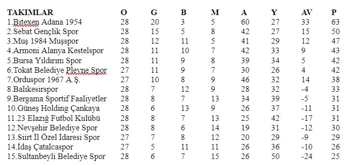 Sebat Gençlik, Muş 1984 Muşspor, Armoni Alanya Kestelspor, Bursa Yıldırım Spor ve Tokat Belediye Plevne Spor arasında yapılacak tek devreli lig usulüne göre oynanacak karşılaşmalarda ilk sırayı alan takım ile oynayacağı maçı kazanması halinde diğer grup birincisi ile 2. Lig’e çıkmak için baraj maçı oynamaya hak kazanacak.
