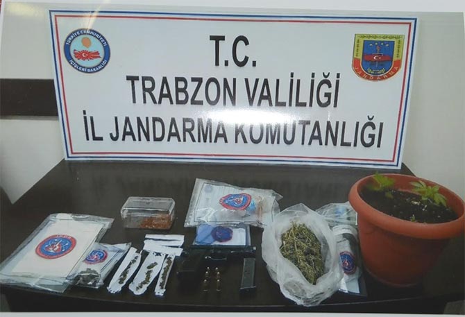 Trabzon İl Jandarma Komutanlığınca; Trabzon İli Akçaabat ve çevre ilçelerde örgütlü olarak “Uyuşturucu veya Uyarıcı Maddi İmal ve Ticareti” suçunu işleyen şahıslara yönelik icra edilen operasyonlar neticesinde Cumhuriyet Başsavcılığınca verilen talimatlar doğrultusunda elde edilen bilgi ve deliler neticesinde Trabzon İl Jandarma Komutanlığınca;12 adrese 8 şüpheliye yönelik yapılan eş zamanlı operasyonlarda; ( 8 ) adet cep telefonu, (15) gram sentetik kannabinoid ( bozia), (350) gram kuban esrar,(90) adet extacy hap, (10) gram kenevir tohumu,(1) kök kenevir bitkisi,(2) adet 9 mm çapında ruhsatsız tabanca ve bu tabancalara ait (2) adet şarjör ile (30) adet 9 mm çapında tabanca fişeği ele geçirilmiştir.