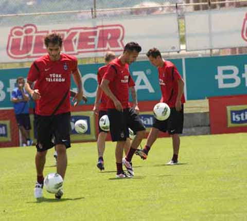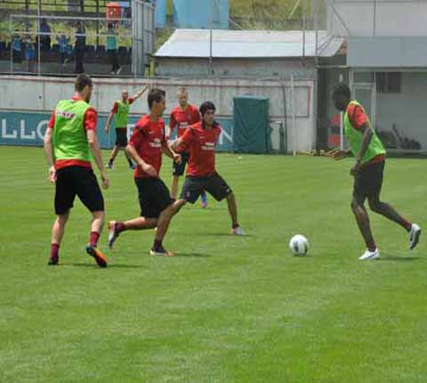 Gruplar halinde birkaç gündür antrenmanlarını sürdüren ve bugün ilk kez toplu bir çalışmada birlikte yer alan futbolcular, pas ve top sürme çalışmasının ardından yarı sahada top kapma antrenmanı gerçekleştirdi. Bordo mavili oyuncuların neşeli halleri dikkat çekerken, özellikle Alanzinho sık sık takım arkadaşlarına takıldı ve antrenmanın neşesi oldu. Zokora ile güreşen Alanzinho, topla yaptığı hareketlerle de göze battı. Antrenmanın son bölümünde Halil Altıntop ve Alanzinho fisyoterapist eşliğinde düz koşu yaptı.