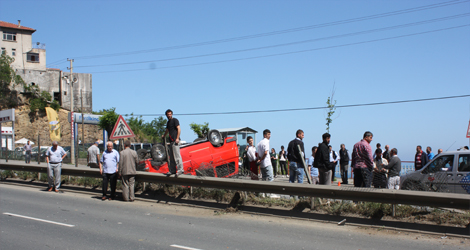İlçemiz Yaylacık Mahallesi sahil yolunda, Trabzon’dan Giresun istikametine gitmekte olan Fatih Kamçı (20) yönetimindeki minibüs, aynı yönde gitmekte olan 55 JG 644 plakalı otobüse çarptı. Çarpmanın etkisiyle sürücünün direksiyon hakimiyetini kaybettiği minibüs orta refüjdeki korkuluklara çarparak ters döndü.